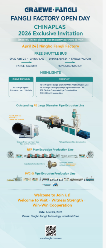 از 21 تا 24 آوریل در CHINAPLAS 2026، از فناوری Fangli در غرفه 7.1C14 بازدید کنید. بیایید نوآوری و همکاری آینده در تجهیزات لوله های پلاستیکی را با هم بررسی کنیم!