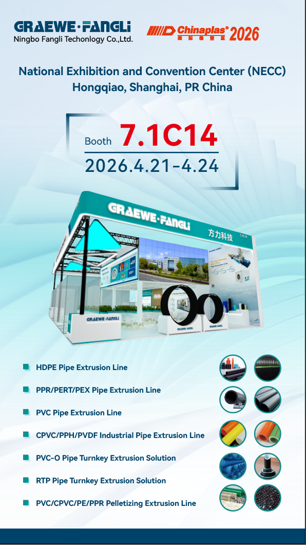 मराठी به غرفه 7.1C14 ما در ChinaPlas 2026 خوش آمدید،Ningbo Fangli Technology Co., Ltd.(از این پس به عنوان "Fangli" نامیده می شود) در تحقیق و توسعه، تولید و فروش تخصص داردتجهیزات اکستروژن پلاستیک, خطوط جدید تولید حفاظت از محیط زیست, ماشین آلات جوش لوله پلاستیک و ماشین آلات کمکی پلاستیک.